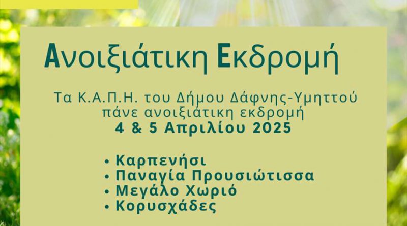Ο Δήμος Δάφνης-Υμηττού διοργανώνει 2ημερη εκδρομή 4&5 Απριλίου 2025 για τα μέλη των Κ.Α.Π.Η. στο Καρπενήσι-Παναγία Προυσιώτισσα- Μεγάλο Χωριό-Κορυσχάδες