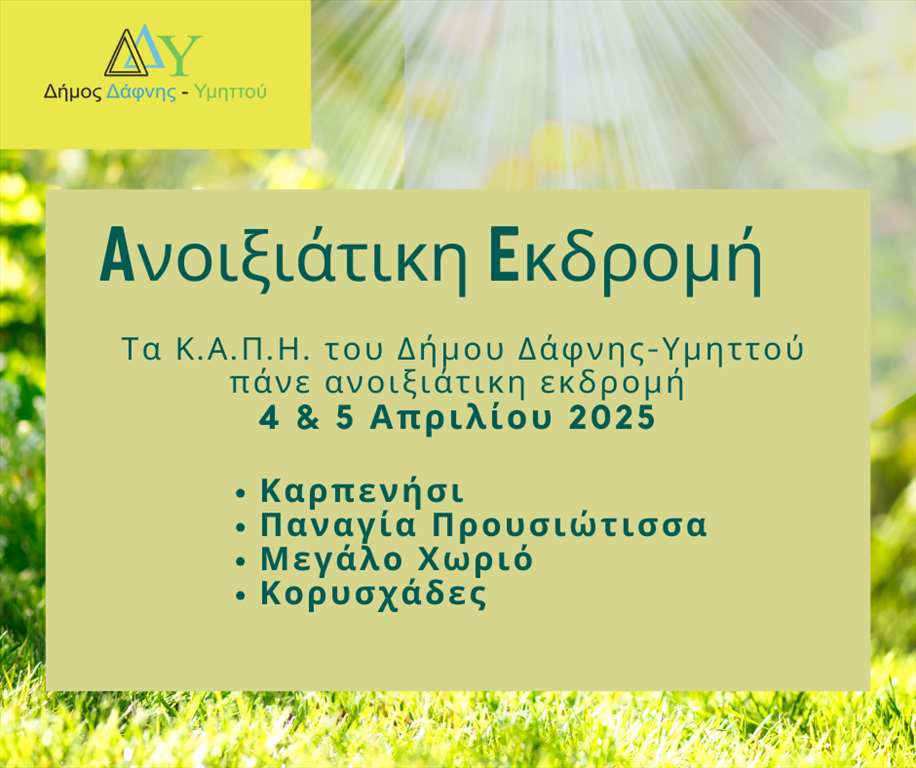 Ο Δήμος Δάφνης-Υμηττού διοργανώνει 2ημερη εκδρομή 4&5 Απριλίου 2025 για τα μέλη των Κ.Α.Π.Η. στο Καρπενήσι-Παναγία Προυσιώτισσα- Μεγάλο Χωριό-Κορυσχάδες