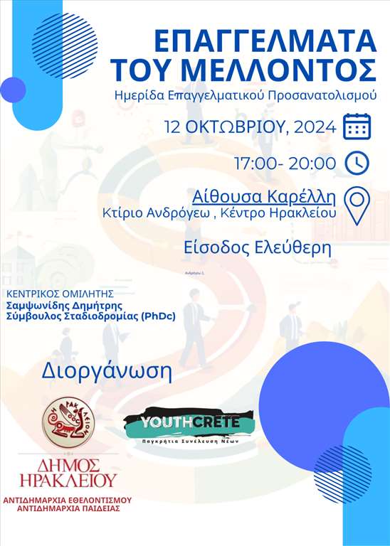 Ο Δήμος Ηράκλειου μέσω των Αντιδημαρχιών Εθελοντισμού και Παιδείας διοργανώνει ημερίδα Επαγγελματικού Προσανατολισμού με θέμα: «Επαγγέλματα του μέλλοντος», σε συνεργασία με το Youth Crete. Η ημερίδα θα πραγματοποιηθεί το Σάββατο 12 Οκτώβριου 2024 στην αίθουσα «Μανόλης Καρέλλης» του Δημοτικού κτιρίου της οδού Ανδρόγεω από τις 17:00 έως 20:00.