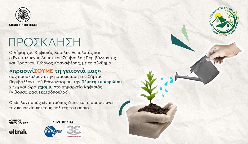 Την Πέμπτη 10 Απριλίου, στις 19:30 στο Δημαρχείο της Κηφισιάς, στην Αίθουσα «Βασ. Γκατσόπουλος» θα πραγματοποιηθεί η παρουσίαση της Χάρτας Περιβαλλοντικού Εθελοντισμού της Διεύθυνσης Περιβάλλοντος και Πρασίνου.
