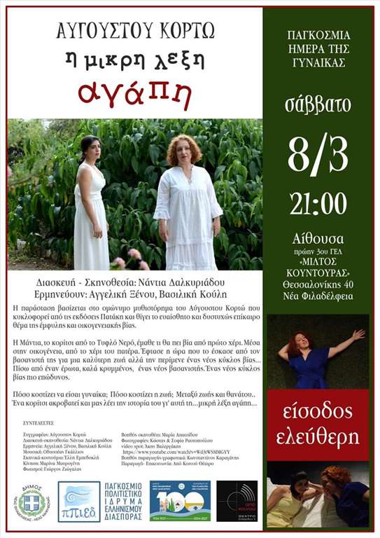21:00 | Θεατρική παράσταση «Η μικρή λέξη αγάπη», στο πρώην 3ο ΓΕΛ «Μίλτος Κουντουράς», Θεσσαλονίκης 40, Νέα Φιλαδέλφεια.