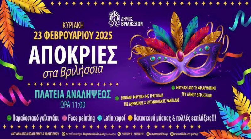 O Δήμος Βριλησσίων γιορτάζει τις απόκριες στην Πλατεία Αναλήψεως, την Κυριακή 23 Φεβρουαρίου 2025 στις 11 το πρωί