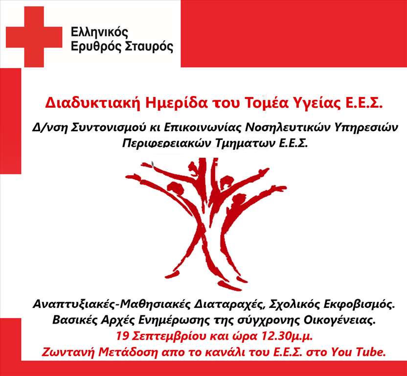 Η Διεύθυνση Συντονισμού και Επικοινωνίας Νοσηλευτικών Υπηρεσιών Περιφερειακών Τμημάτων του Ελληνικού Ερυθρού Σταυρού οργανώνει την Δευτέρα 19 Σεπτεμβρίου 2022 και ώρα 12.30 μ.μ., διαδικτυακή ημερίδα, η οποία θα μεταδοθεί ζωντανά στο επίσημο κανάλι του Ε.Ε.Σ. στο YouTube, με θέμα: «Αναπτυξιακές – μαθησιακές διαταραχές, σχολικός εκφοβισμός. Βασικές αρχές ενημέρωσης της σύγχρονης οικογένειας.»