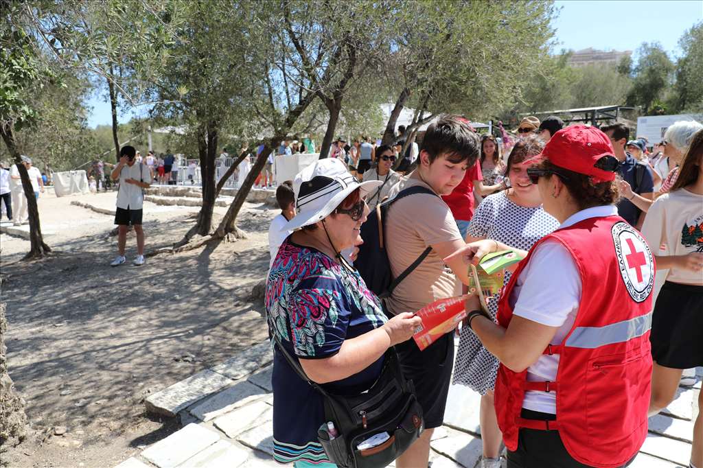 Με επιτυχία πραγματοποιήθηκε την Παρασκευή (19/7) η μεγάλη δράση υποστήριξης των επισκεπτών της Ακρόπολης λόγω καύσωνα από τον Ελληνικό Ερυθρό Σταυρό, προσφέροντας στους χιλιάδες επισκέπτες στιγμές δροσιάς, Πρώτες Βοήθειες αλλά και αναλυτική ενημέρωση για τους δυνητικούς κινδύνους που απορρέουν από τις υψηλές θερμοκρασίες.