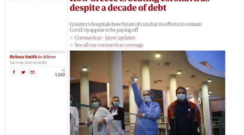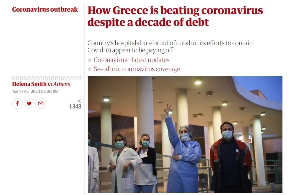 Άρθρο, με τίτλο πώς η Ελλάδα κερδίζει τον κορoνοϊό παρά τη δεκαετή κρίση χρέους και υπότιτλο τα νοσοκομεία της χώρας, σήκωσαν το βάρος των περικοπών, όμως οι προσπάθειές τους να περιορίσουν τον Covid-19 φαίνεται ότι αποδίδουν φιλοξενεί η Guardian της ανταποκρίτριας της εφημερίδας στην Αθήνα, Helena Smith.
