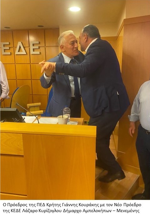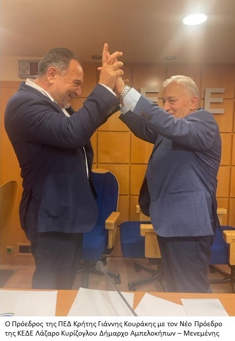 Στη διαδικασία της εκλογής του νέου Προέδρου της ΚΕΔΕ, που έγινε στα γραφεία της ΚΕΔΕ, παρέστη ο Πρόεδρος της Περιφερειακής Ένωσης Δήμων (ΠΕΔ) Κρήτης Γιάννης Κουράκης, καθώς και Πρόεδροι των ΠΕΔ της χώρας.