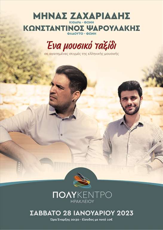 Συνεχίζονται οι ξεχωριστές μουσικές βραδιές στο Πολύκεντρο Ηρακλείου, το Σάββατο 28 Ιανουαρίου και ώρα 20:30. Ο Μηνάς Ζαχαριάδης με την φωνή του κάνει ένα υπέροχο μουσικό ταξίδι στα μονοπάτια του ελληνικού τραγουδιού με έντεχνη και ροκ διάθεση. Ο Κωνσταντίνος Ψαρουλάκης με το φλάουτο του, βάζει τις δικές του ξεχωριστές πινελιές!