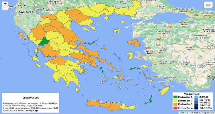 28 από τις 74 περιοχές της χώρας βρίσκονται στο πορτοκαλί. Ο επιδημιολογικός χάρτης θα παράγεται εβδομαδιαίως σε επίπεδο Περιφερειακής ενότητας και ειδικά για τα νησιά σε επίπεδο Δήμου.