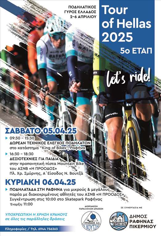 Ο Δήμος Ραφήνας – Πικερμίου υποδέχεται, την Κυριακή 6 Απριλίου 2025, τον διεθνή ποδηλατικό γύρο ΔΕΗ Tour of Hellas 2025. Η Διεύθυνση Αθλητισμού του Δήμου σε συνεργασία με τον Αθλητικό Σύλλογο Ν. Βουτζά «Η ΠΡΟΟΔΟΣ» έχουν προγραμματιστεί παράλληλες δράσεις για μικρούς και μεγάλους, σε ένα Σαββατοκύριακο αφιερωμένο στην ποδηλασία!