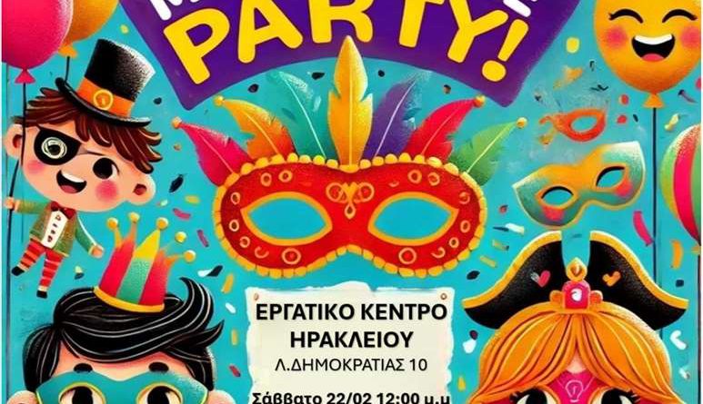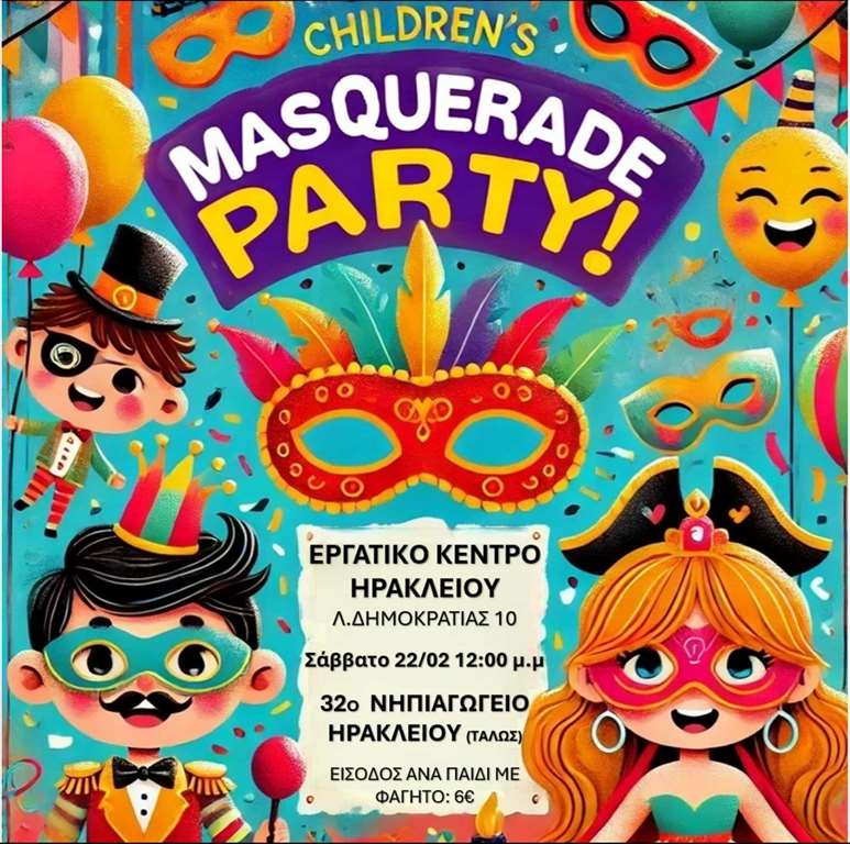 Ο σύλλογος γονέων και κηδεμόνων του 32ου Νηπιαγωγείου Ηρακλειου (ΤΑΛΩΣ) σας προσκαλεί στον ετήσιο αποκριάτικο χορό που θα γίνει το Σάββατο στις 22/02, στις 12:00 το μεσημερι, στο Εργατικό Κέντρο Ηρακλείου, Λεωφόρος Δημοκρατίας 10. Σας περιμένουμε όλους και όλες με τα παιδιά σας εννοείται και την καλή, πλην ξέφρενη διάθεση σας. Κόστος ανά παιδί με φαγητό, 6€. Στο χώρο θα υπάρχει και ανιματέρ για τα παιδιά! Χορός, παιχνίδι, δώρα και εκπληξεις.