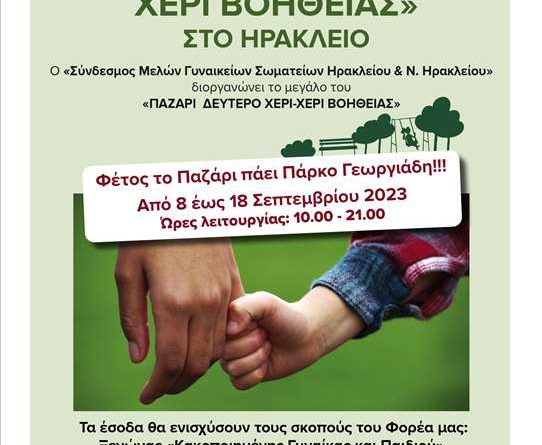 Ο «Σύνδεσμος Μελών Γυναικείων Σωματείων Ηρακλείου και Ν. Ηρακλείου» οργανώνει και φέτος το καθιερωμένο του «ΠΑΖΑΡΙ ΔΕΥΤΕΡΟ ΧΕΡΙ – ΧΕΡΙ ΒΟΗΘΕΙΑΣ», το οποίο θα πραγματοποιηθεί από την Παρασκευή 8 Σεπτεμβρίου έως τη Δευτέρα 18 Σεπτεμβρίου 2023 στο ΠΑΡΚΟ ΓΕΩΡΓΙΑΔΗ και ώρες 10.00 – 21.00.