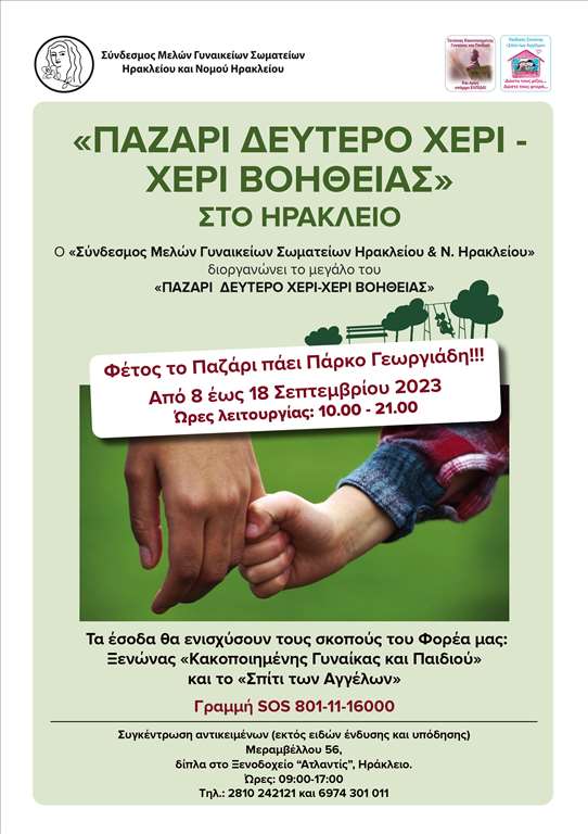 Ο «Σύνδεσμος Μελών Γυναικείων Σωματείων Ηρακλείου και Ν. Ηρακλείου» οργανώνει και φέτος το καθιερωμένο του «ΠΑΖΑΡΙ ΔΕΥΤΕΡΟ ΧΕΡΙ – ΧΕΡΙ ΒΟΗΘΕΙΑΣ», το οποίο θα πραγματοποιηθεί από την Παρασκευή 8 Σεπτεμβρίου έως τη Δευτέρα 18 Σεπτεμβρίου 2023 στο ΠΑΡΚΟ ΓΕΩΡΓΙΑΔΗ και ώρες 10.00 – 21.00.