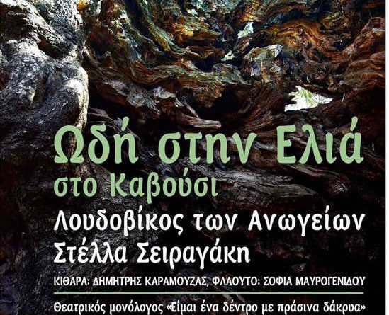 Ο πολιτιστικός σύλλογος Καβουσίου διοργανώνει εκδήλωση «Ωδή στην ελιά με τον Λουδοβίκο των Ανωγείων και τη Στέλλα Σειραγάκη» με τη στήριξη της Περιφέρειας Κρήτης το Σάββατο 21 Σεπτεμβρίου στις 21.00 μ.μ. στην αυλή της αρχαίας ελιάς στο Καβούσι με ελεύθερη είσοδο για τους πολίτες.