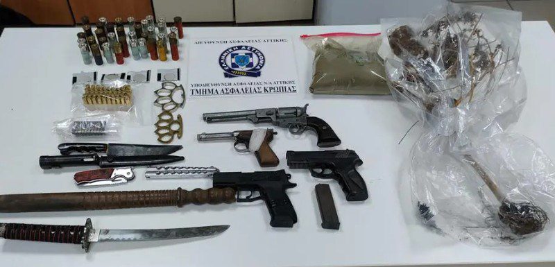 Πιο συγκεκιμένα, βρέθηκαν και κατασχέθηκαν 4 ρέπλικες όπλων (3 πιστόλια και περίστροφο), 133 φυσίγγια, 1 κενός γεμιστήρας πιστολιού, 2 σιδερογροθιές, 1 σπαθί τύπου κατάνα, 1 ξύλινο γκλοπ, 1 ξιφολόγχη και 3 μαχαίρια.