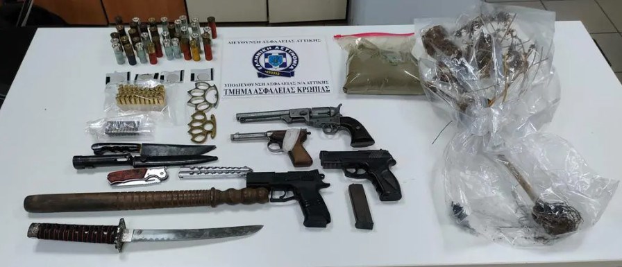 Πιο συγκεκιμένα, βρέθηκαν και κατασχέθηκαν 4 ρέπλικες όπλων (3 πιστόλια και περίστροφο), 133 φυσίγγια, 1 κενός γεμιστήρας πιστολιού, 2 σιδερογροθιές, 1 σπαθί τύπου κατάνα, 1 ξύλινο γκλοπ, 1 ξιφολόγχη και 3 μαχαίρια.