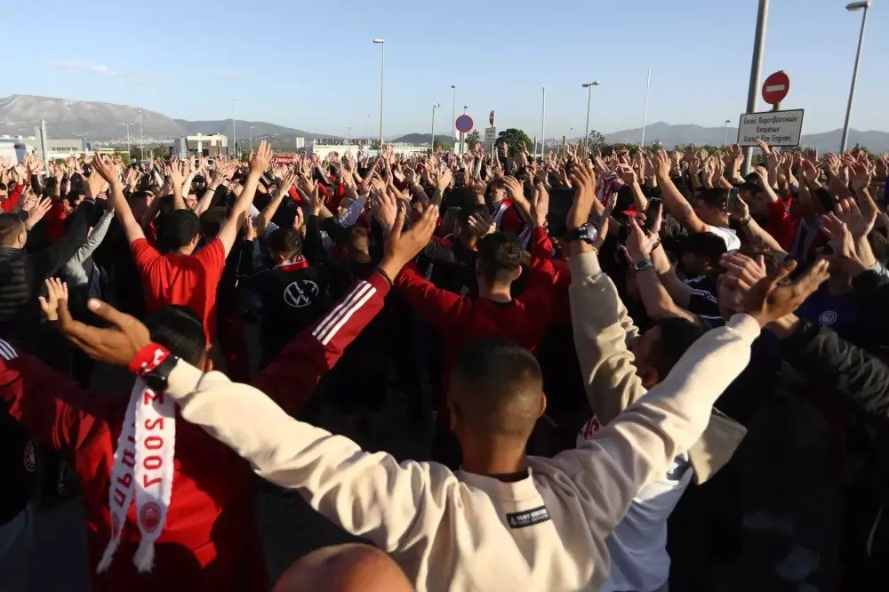 Εκατοντάδες οπαδοί του Ολυμπιακού συγκεντρώθηκαν από νωρίς το πρωί της Μεγάλης Παρασκευής στο αεροδρόμιο Ελευθέριος Βενιζέλος για να υποδεχτούν τους παίκτες του Ολυμπιακού μετά τη θεαματική νίκη στην έδρα της Άστον Βίλα.