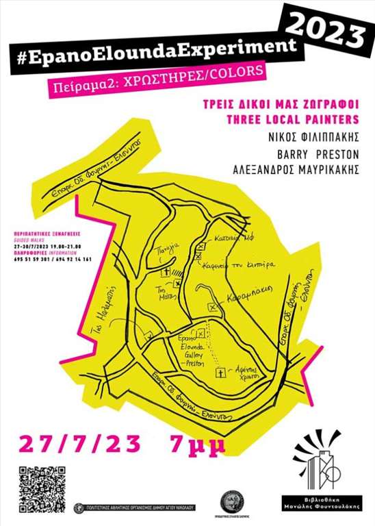 Το δεύτερο πείραμα πολιτισμού της ΒΙΒΛΙΟΘΗΚΗΣ “Μανώλης Φουντουλάκης” στην Επάνω Ελούντα διασχίζει φέτος τα σοκάκια της, ανοίγει κλειστά σπίτια, παλιά καφενεία, εκκλησιές, φάμπρικες και φιλοξενεί την ομαδική αναδρομική έκθεση ζωγραφικής με τίτλο: «ΧΡΩΣΤΗΡΕΣ-ΤΡΕΙΣ ΔΙΚΟΙ ΜΑΣ ΖΩΓΡΑΦΟΙ».