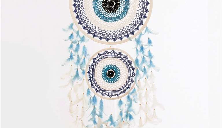 Ονειροπαγίδα πλεκτή μάτι με λευκά και γαλάζια φτερά