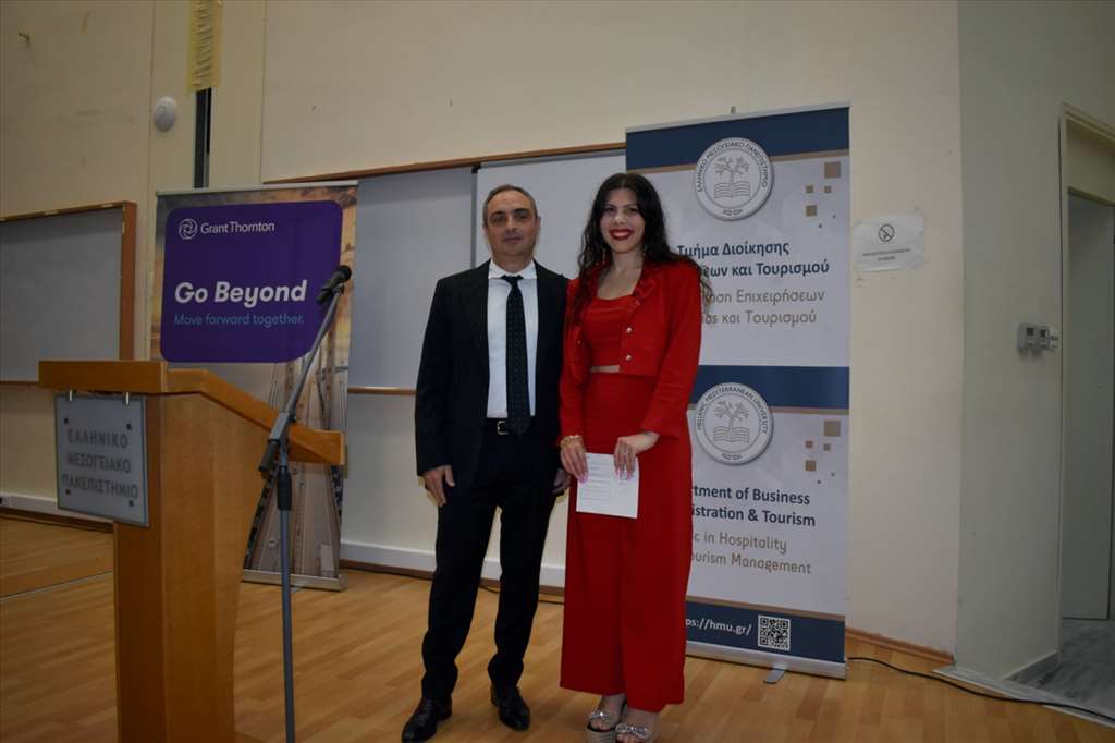 Ιδιαίτερη στιγμή στην εκδήλωση, η απονομή βραβείου αριστείας στην απόφοιτο με την καλύτερη επίδοση κα. Ρόζα Ρωμανώφ από το μέλος του Διοικητικού Συμβουλίου της εταιρείας Grant Thornton, κ. Κωνσταντίνο Αντωνακάκη, στο πλαίσιο του μνημονίου συνεργασίας της εταιρείας με το ΕΛΜΕΠΑ και τη Σχολή Επιστημών Διοίκησης και Οικονομίας.