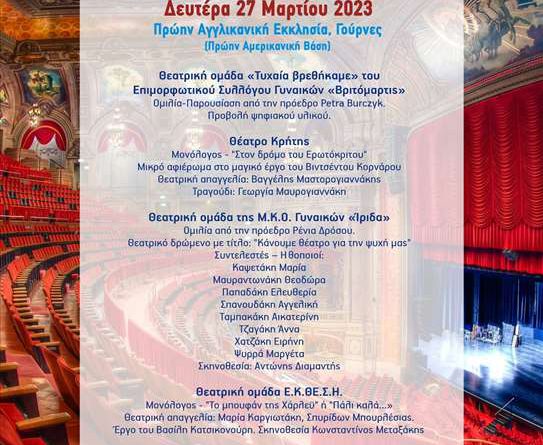 Θεατρικό δρώμενο με τίτλο: “Κάνουμε Θέατρο για την Ψυχή μας”, με αποσπάσματα κειμένων που έχουν γράψει μεγάλοι συγγραφείς, σκηνοθέτες και ηθοποιοί του θεάτρου για την Παγκόσμια Ημέρα Θεάτρου, με πρωταγωνίστρια – ηρωίδα την γυναίκα.