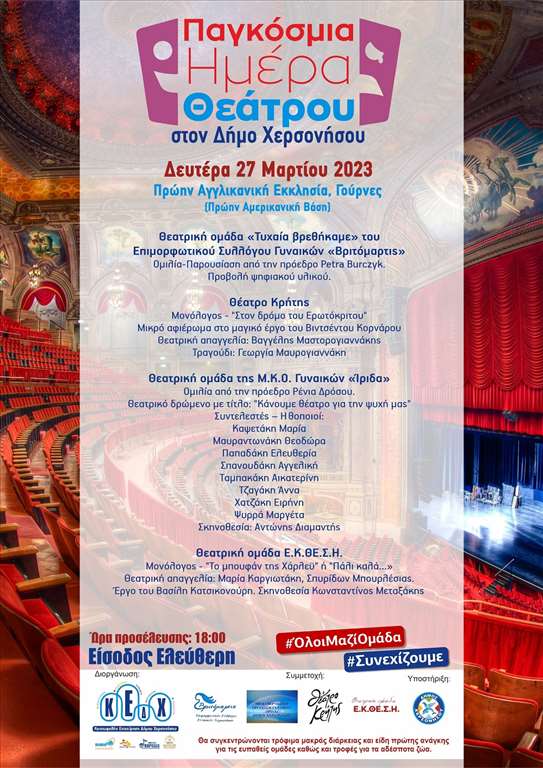 Με αφορμή τον εορτασμό της Παγκόσμιας Ημέρας Θεάτρου, στις 27 Μαρτίου, η Κοινωφελής Επιχείρηση Δήμου Χερσονήσου (Κ.Ε.Δ.Χ.) διοργανώνει εκδήλωση και προσκαλεί τους φίλους του θεάτρου να παρακολουθήσουν ομιλίες και θεατρικά δρώμενα. Συμμετέχουν ερασιτεχνικές θεατρικές ομάδες Πολιτιστικών Συλλόγων/Φορέων που δραστηριοποιούνται στον Δήμο Χερσονήσου, καθώς και επαγγελματικές θεατρικές ομάδες, με σκοπό την ανάδειξη και προβολή του έργου τους.