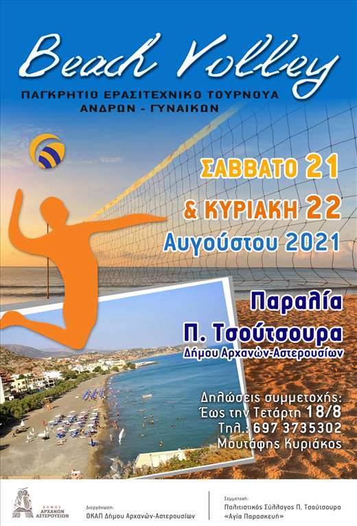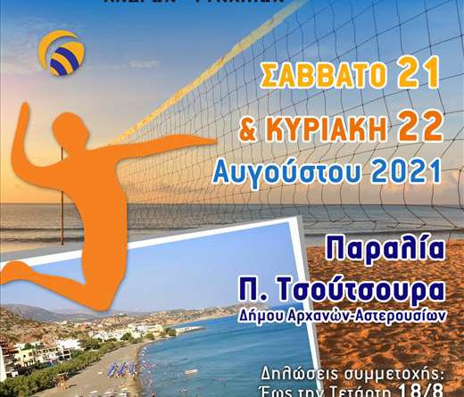 Ο ΟΚΑΠ του Δήμου Αρχανών Αστερουσίων διοργανώνει Παγκρήτιο τουρνουά BEACH VOLLEY για γυναίκες και άνδρες το Σάββατο και την Κυριακή 21-22 Αυγούστου.