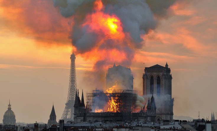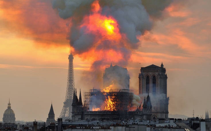 Και τούτο γιατί και τα αρχιτεκτονικά μνημεία δεν μένουν στατικά μέσα στην πορεία τους, στην ιστορία και στις διακυμάνσεις στην αντίληψη των εκάστοτε γενεών για το κάλλος και το υψηλόν. Πράγματι, ο αρχιτέκτονας Βιολέ-λε-Ντυκ που είχε αναλάβει στα μέσα του 19ο αιώνα τη ριζική ανακαίνιση της Παναγίας, είχε προσθέσει τους αποτροπαϊκούς δαίμονες (τα γνωστά gargoyle), που προφανώς δεν είχε οραματισθεί ο επίσκοπος Μορίς ντε Σουλί στον 12ο αιώνα. Όπως επίσης της πρόσθεσε και τον πυργίσκο του «Βέλους», ο οποίος κατέρρευσε από τις φλόγες, και στον οποίο ουδέποτε μπόρεσε να σκαρφαλώσει ο καμπούρης κωδωνοκρούστης Κουασιμόδος, καθώς το λογοτεχνικό έργο του Βίκτωρος Ουγκώ κυκλοφόρησε το 1831. Ο ίδιος ο Ουγκώ μέσα στις σελίδες του περιέγραφε «τη μεγάλη φωτιά ανάμεσα στους δύο πύργους», όπως ακριβώς φαίνεται στη φωτογραφία που κυκλοφορεί σε όλα τα μέσα ενημέρωσης και το διαδίκτυο, σύμφωνα με το Αθηναϊκό Πρακτορείο Ειδήσεων.