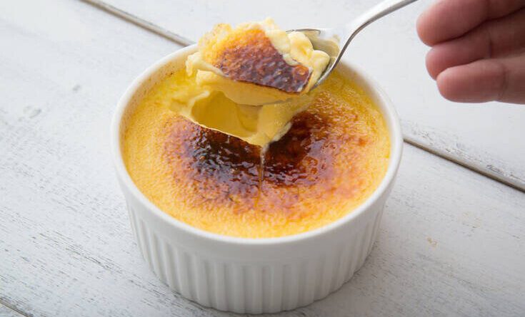 Πασπαλίστε την κρέμα με μια κουταλιά της σούπας ζάχαρη και λιώστε την με την βοήθεια ενός φλόγιστρου για τραγανή υφή.