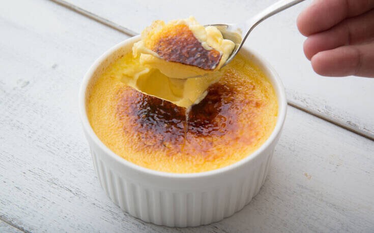 Πασπαλίστε την κρέμα με μια κουταλιά της σούπας ζάχαρη και λιώστε την με την βοήθεια ενός φλόγιστρου για τραγανή υφή.