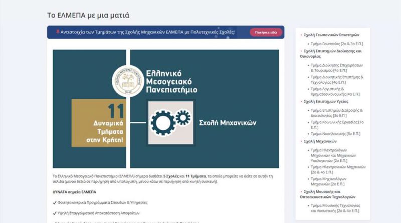 Το Ελληνικό Μεσογειακό Πανεπιστήμιο (ΕΛΜΕΠΑ) διαθέτει 5 Σχολές και 11 Τμήματα. Η δυνατότητα περιήγησης κάθε ενδιαφερόμενου σε αυτά μέσω της σελίδας (από υπολογιστή και από κινητή συσκευή), προσφέρει άμεσα μια σφαιρική εικόνα για τα γνωστικά αντικείμενα, τα διεπιστημονικά πεδία σπουδών και τις «διαχρονικά» σύγχρονες ειδικότητες που εφοδιάζουν τους πτυχιούχους τους με ανθεκτικότητα στους κραδασμούς της ανταγωνιστικής αγοράς εργασίας και ευελιξία επιλογών ανάμεσα σε εναλλακτικές επαγγελματικές διαδρομές που διασφαλίζουν την απασχολησιμότητα και την επαγγελματική τους ανάπτυξη.