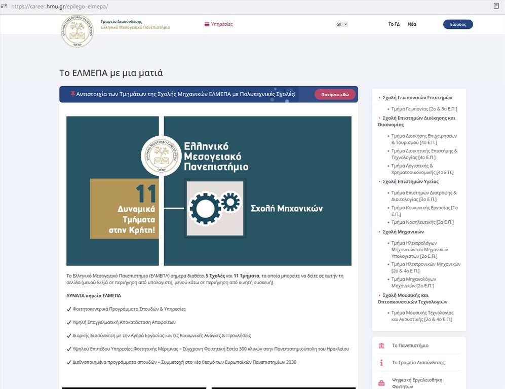 Στο πλαίσιο της δράσης “Μαθαίνω για το ΕΛΜΕΠΑ – Επιλέγω ΕΛΜΕΠΑ” 2024, κάθε ενδιαφερόμενος έχει τη δυνατότητα να ενημερωθεί άμεσα για όλα τα Τμήματα του ΕΛΜΕΠΑ μέσω οπτικοακουστικού υλικού που περιλαμβάνεται στο επικαιροποιημένο Micro-site παρουσίασης ΕΛΜΕΠΑ: https://career.hmu.gr/epilego-elmepa