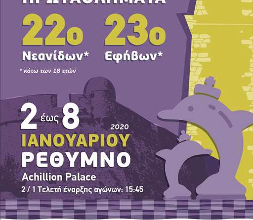 Ο Σκακιστικός Όμιλος Ρεθύμνου με συνδιοργανωτές την Περιφέρεια Κρήτης, τον Δήμο Ρεθύμνου και την Ελληνική Σκακιστική Ομοσπονδία διοργανώνει για δεύτερη συνεχή χρονιά τα Πανελλήνια Πρωταθλήματα ατομικά κάτω των 18 και συγκεκριμένα το 23ο για τους έφηβους και το 22ο για τις νεάνιδες. Ο χώρος διεξαγωγής των αγώνων είναι ο συνεδριακός χώρος του Αχίλλειον Παλλάς και οι αγώνες ξεκινάνε την Πέμπτη 2 Ιανουαρίου (15.45 τελετή έναρξης) και τελειώνουν την Τετάρτη 8 Ιανουαρίου (15.45 τελετή λήξης).