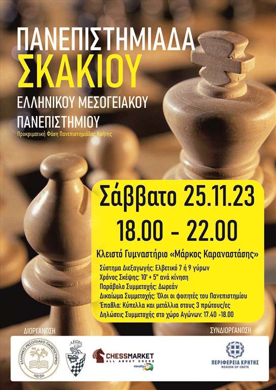 Ο Σκακιστικός Όμιλος «Λέων Κάντια», το Πανεπιστήμιο Κρήτης και Ελληνικό Μεσογειακό Πανεπιστήμιο με την υποστήριξη της Περιφέρειας Κρήτης συνδιοργανώνουν τις προκριματικές φάσεις της «Σκακιστικής Πανεπιστημιάδας Κρήτης».
