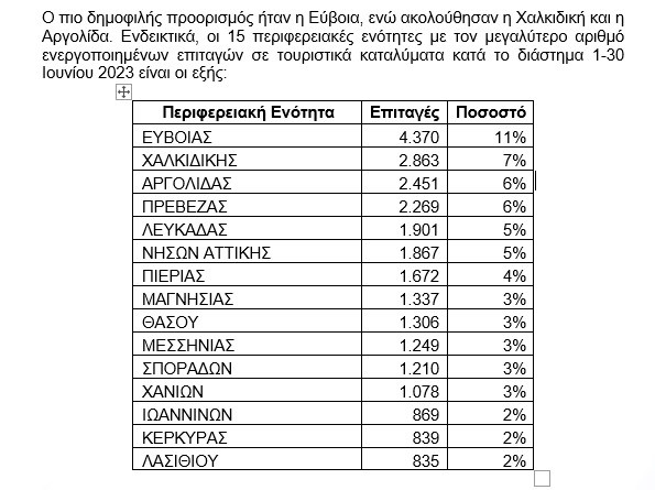 Ο πιο δημοφιλής προορισμός ήταν η Εύβοια, ενώ ακολούθησαν η Χαλκιδική και η Αργολίδα. Ενδεικτικά, οι 15 περιφερειακές ενότητες με τον μεγαλύτερο αριθμό ενεργοποιημένων επιταγών σε τουριστικά καταλύματα κατά το διάστημα 1-30 Ιουνίου 2023 είναι οι εξής:
