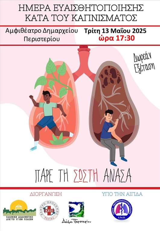 Η εκδήλωση διοργανώνεται από το Ελληνικό Διαδημοτικό Δίκτυο Υγιών Πόλεων, το ΚΕΠ Υγείας και τον Δήμο Περιστερίου, και τελεί υπό την αιγίδα της Ένωσης Πνευμονολόγων Ελλάδας.