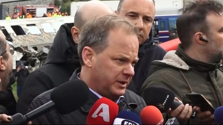 Θοδωρής Ρουσόπουλος, Γιώργος Κουμουτσάκος, Μπάμπης Παπαδημητρίου και Φωτεινή Πιπιλή δείχνουν την έξοδο στον Κώστα Καραμανλή, μετά τη φονική σιδηροδρομική σύγκρουση στα Τέμπη.