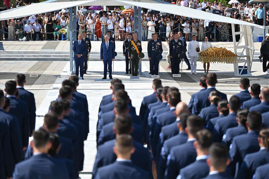 Ο Υπουργός Εθνικής Άμυνας, Νίκος Δένδιας, παρέστη σήμερα, Τρίτη 8 Ιουλίου 2025, ως εκπρόσωπος του Πρόεδρου της Ελληνικής Κυβέρνησης, στην τελετή Ορκωμοσίας των Νέων Ανθυποσμηναγών Τάξεως 2025, που διεξήχθη στις εγκαταστάσεις της Σχολής Ικάρων στο Τατόι, ενώπιον της Α.Ε. του Προέδρου της Δημοκρατίας Κωνσταντίνου Τασούλα, ο οποίος επέδωσε και τα ξίφη στους ορκισθέντες Ανθυποσμηναγούς της Πολεμικής Αεροπορίας. Δοξολογία τέλεσε ο Μητροπολίτης Ιλίου, Αχαρνών και Πετρουπόλεως κ.κ. Αθηναγόρας.
