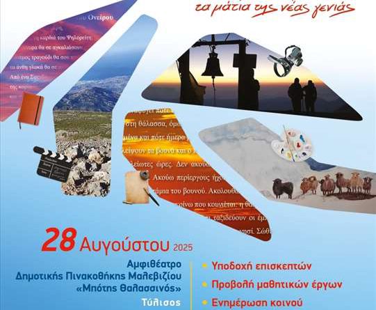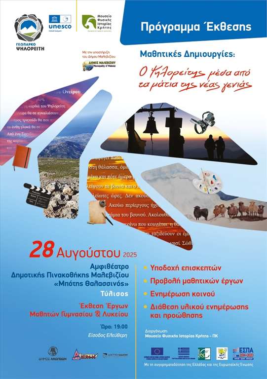 Τα έργα μαθητών Γυμνασίων και Λυκείων που συμμετείχαν στον διαγωνισμό με τίτλο «Ο Ψηλορείτης εμπνέει!», ο οποίος διήρκεσε από τον Δεκέμβριο του 2024 έως και τον Μάρτιο του 2025, θα εκτεθούν σε ειδική εκδήλωση που θα πραγματοποιηθεί στη Δημοτική Πινακοθήκη Μαλεβιζίου την Πέμπτη 28 Αυγούστου.
