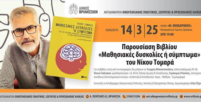 Το βιβλίο του Συμβούλου-Ψυχοθεραπευτή και Ειδικού Παιδαγωγού Νίκου Τομαρά: «Μαθησιακές δυσκολίες ή σύμπτωμα» παρουσιάζεται την Παρασκευή 14/3/2025 στις 19:00 στην αίθουσα Ν. Εγγονόπουλος στο πάρκο Μ. Θεοδωράκης (πρ. ΤΥΠΕΤ)