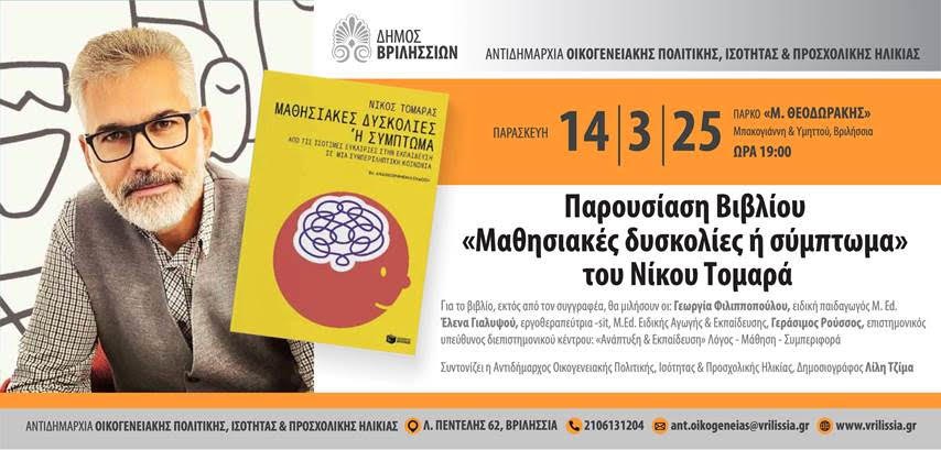 Το βιβλίο του Συμβούλου-Ψυχοθεραπευτή και Ειδικού Παιδαγωγού Νίκου Τομαρά: «Μαθησιακές δυσκολίες ή σύμπτωμα» παρουσιάζεται την Παρασκευή 14/3/2025 στις 19:00 στην αίθουσα Ν. Εγγονόπουλος στο πάρκο Μ. Θεοδωράκης (πρ. ΤΥΠΕΤ)