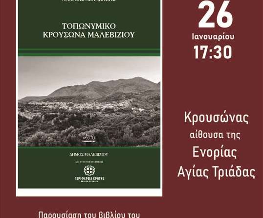 Την Πέμπτη στις 17.30 στην αίθουσα της Ενορίας Αγίας Τριάδας στον Κρουσώνα θα γίνει η παρουσίαση του βιβλίου «Τοπωνυμικό Κρουσώνα Μαλεβιζίου».