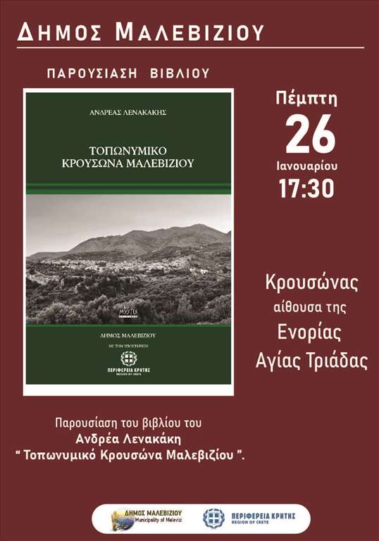 Την Πέμπτη στις 17.30 στην αίθουσα της Ενορίας Αγίας Τριάδας στον Κρουσώνα θα γίνει η παρουσίαση του βιβλίου «Τοπωνυμικό Κρουσώνα Μαλεβιζίου».