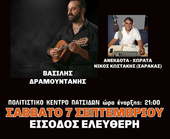Η εκδήλωση που ο Πολιτιστικός Σύλλογος Πατσίδων τα τελευταία χρόνια έχει καθιερώσει για να σμίγουμε να λέμε μαντινάδες να χορεύουμε να γελάμε να βεγγερίζουμε και να αποχαιρετούμε το καλοκαίρι!!Μαζί μας ο Βασίλης Δραμουντάνης με την παρέα του θα μας ταξιδέψει με το μαντολίνο του και ο Νίκος Κωστάκης(ΣΑΡΑΚΑΣ)με τα ανέκδοτα και τα χωρατά του.Σάββατο 7 Σεπτεμβρίου στις 21.00 στο Πολιτιστικό Κέντρο Πατσίδων.ΕΙΣΟΔΟΣ ΕΛΕΥΘΕΡΗ!