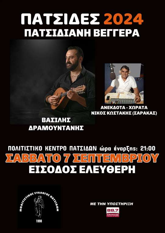 Η εκδήλωση που ο Πολιτιστικός Σύλλογος Πατσίδων τα τελευταία χρόνια έχει καθιερώσει για να σμίγουμε να λέμε μαντινάδες να χορεύουμε να γελάμε να βεγγερίζουμε και να αποχαιρετούμε το καλοκαίρι!!Μαζί μας ο Βασίλης Δραμουντάνης με την παρέα του θα μας ταξιδέψει με το μαντολίνο του και ο Νίκος Κωστάκης(ΣΑΡΑΚΑΣ)με τα ανέκδοτα και τα χωρατά του.Σάββατο 7 Σεπτεμβρίου στις 21.00 στο Πολιτιστικό Κέντρο Πατσίδων.ΕΙΣΟΔΟΣ ΕΛΕΥΘΕΡΗ!