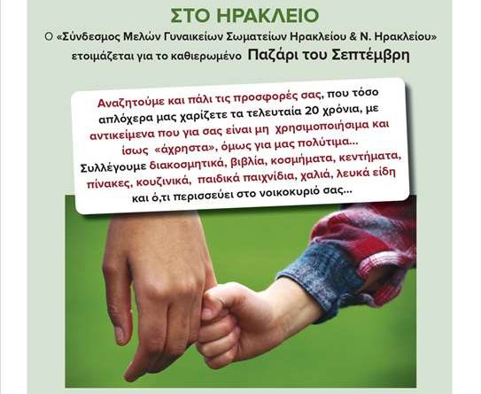 Ο «Σύνδεσμος Μελών Γυναικείων Σωματείων Ηρακλείου και Ν. Ηρακλείου» οργανώνει και φέτος το καθιερωμένο του «ΠΑΖΑΡΙ ΔΕΥΤΕΡΟ ΧΕΡΙ-ΧΕΡΙ ΒΟΗΘΕΙΑΣ», το οποίο θα πραγματοποιηθεί τον προσεχή Σεπτέμβριο στο Ηράκλειο.