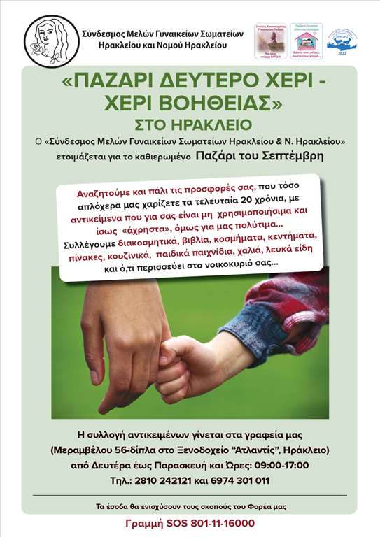 Ο «Σύνδεσμος Μελών Γυναικείων Σωματείων Ηρακλείου και Ν. Ηρακλείου» οργανώνει και φέτος το καθιερωμένο του «ΠΑΖΑΡΙ ΔΕΥΤΕΡΟ ΧΕΡΙ-ΧΕΡΙ ΒΟΗΘΕΙΑΣ», το οποίο θα πραγματοποιηθεί τον προσεχή Σεπτέμβριο στο Ηράκλειο.