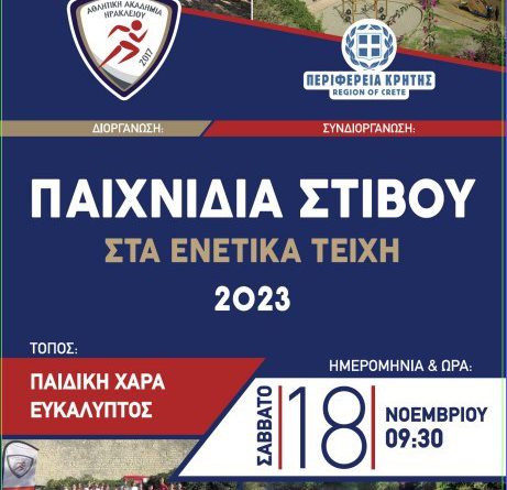 Η «Αθλητική Ακαδημία Ηρακλείου Κρήτης 2017» και η Περιφέρεια Κρήτης συνδιοργανώνουν τα «Παιχνίδια Στίβου στα Ενετικά Τείχη». Η εκδήλωση θα πραγματοποιηθεί το Σάββατο 18 Νοεμβρίου στον χώρο της παιδικής χαράς στη περιοχή «Κομμένο Μπεντένι» στο Ηράκλειο, με ώρα έναρξης 09:30 π.μ.