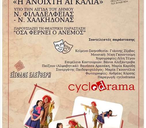 Την Κυριακή 30 Μαρτίου 2025 στις 11 πμ στο πρώην 3ο ΓΕΛ – Αίθουσα Μίλτος Κουντουράς (Θεσσαλονίκης 40 Νέα Φιλαδέλφεια), ο Σύλλογος Γονέων – Κηδεμόνων και Φίλων Α.ΜΕ.Α η "ΑΝΟΙΧΤΗ ΑΓΚΑΛΙΑ", υπό την αιγίδα του Δήμου Νέας Φιλαδέλφειας-Νέας Χαλκηδόνας, παρουσιάζει τη θεατρική παράσταση "Όσα φέρνει ο άνεμος", για παιδιά προσχολικής και σχολικής ηλικίας με θέμα την κατανόηση, την αποδοχή και τον σεβασμό της διαφορετικότητας των ατόμων με αναπηρία στο σχολικό και όχι μόνο περιβάλλον.