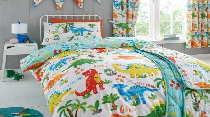 Ανανεώστε το παιδικό κρεβάτι του παιδιού σας με νέο λευκό πάπλωμα με σχέδια από δεινόσαυρους.