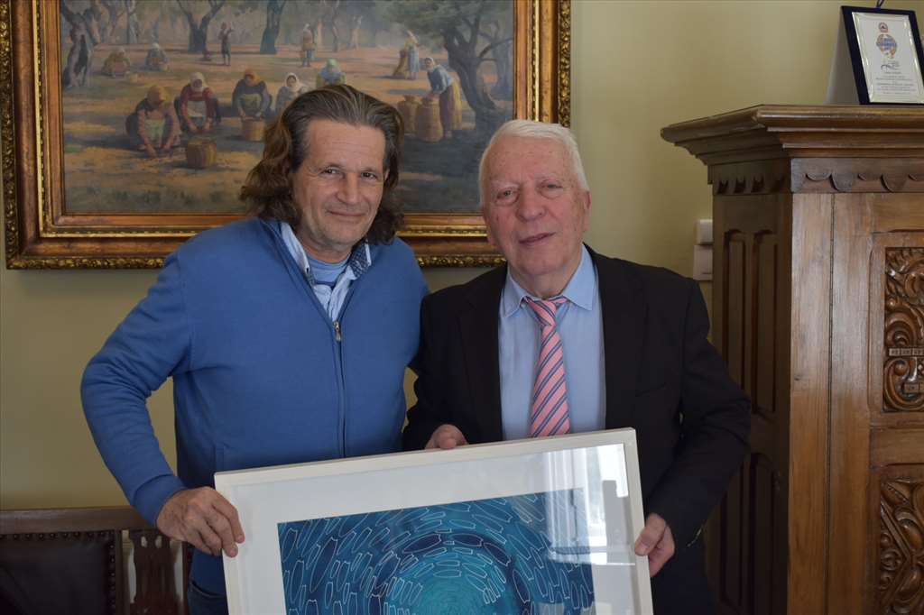 Ο Περιφερειάρχης συζήτησε με τον Ισραηλινό επιχειρηματία τις αναπτυξιακές δυνατότητες που έχει η Λέσβος και τα νησιά του Βορείου Αιγαίου, σημειώνοντας την αλλαγή σελίδας που έχει επιτευχθεί τα τελευταία χρόνια στους τομείς του τουρισμού, ενώ δέχτηκε ως δώρο έναν πίνακα.